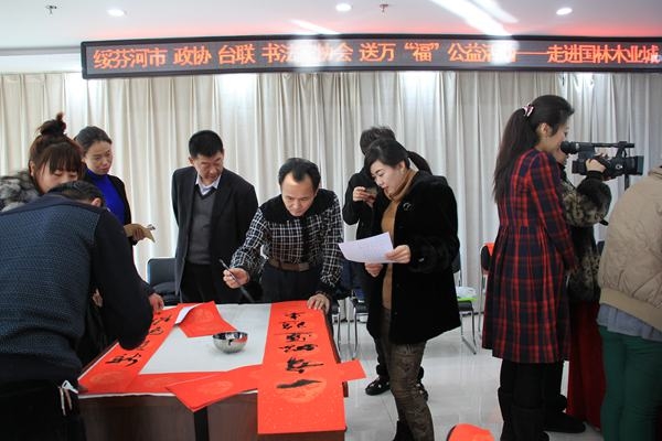 1月10日,绥芬河市政协、台联、书法家协会送万“福”公益活动,来到国林木业城为园区企业送“福”字、写春联。